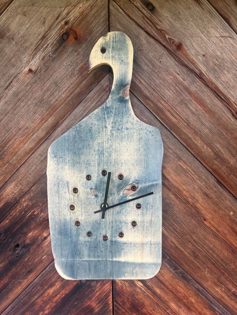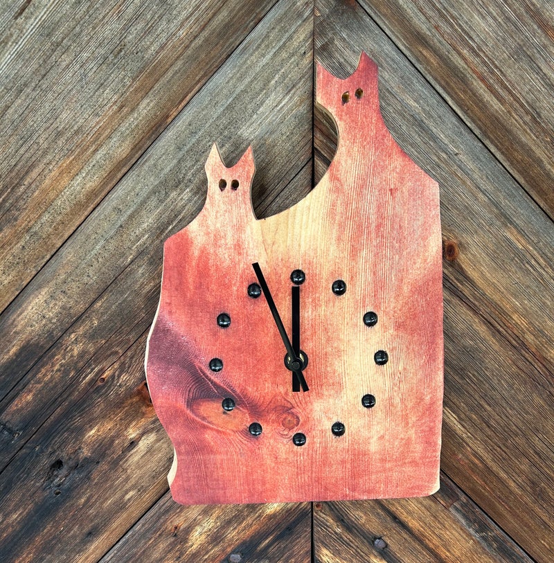 Klokker av furu villmarkspanel som er beiset/oljet og med epoxy i "øyne". Kvarts urverk.